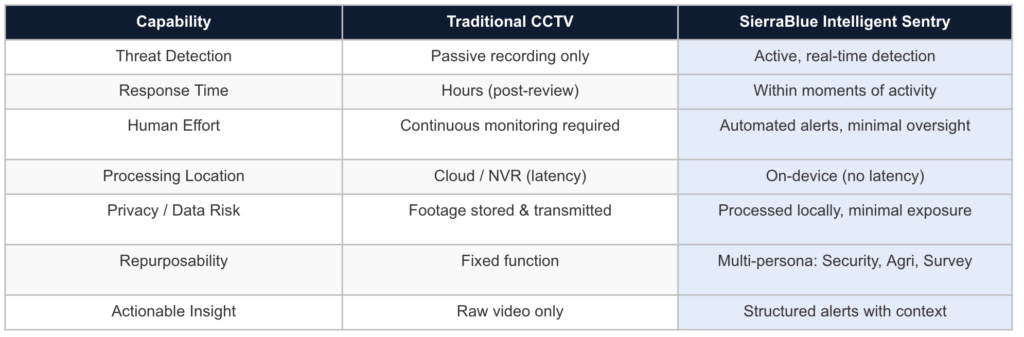 Conventional Cameras only record. They cannot understand situations. The answer lies not in the number of cameras, but in how they function. Today’s surveillance systems are built on a fundamentally flawed premise — they record everything but understand nothing. Cameras generate enormous volumes of footage that flood into control rooms, requiring human operators to watch, interpret, and respond. The Intelligence Gap lies in Perception vs. Recording. This model, designed in an era before artificial intelligence, has not kept pace with the scale and speed of modern security threats. There is a fundamental distinction between recording a scene and perceiving it. A camera captures photons. Perception requires understanding — the ability to classify objects, detect anomalies, infer intent, and generate a meaningful response. For instance, traditional cameras see a person crossing a restricted boundary at 2 AM but understand none of it.