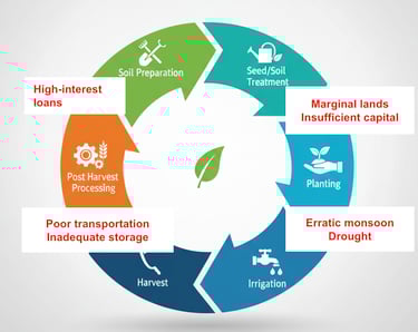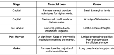 The stark income disparity necessitates addressing its underlying structural causes: fragmented landholdings, heightened climate vulnerability, and an inefficient and leaky post-harvest supply chain. Approximately 86% of farmers own marginal or small lands which hinders the ability to adopt modern practices, access credit, and profitably sell market produce. They are highly susceptible to erratic weather, resulting in crop failures and income losses due to inadequate irrigation and climate-vulnerable infrastructure. An inefficient post-harvest supply chain further exacerbates these losses through poor storage, transportation, and limited processing facilities. The farmer is trapped in cycles of debt and poverty, depriving him of his rightful share of the produce's value, while simultaneously leading to food wastage and higher consumer prices.