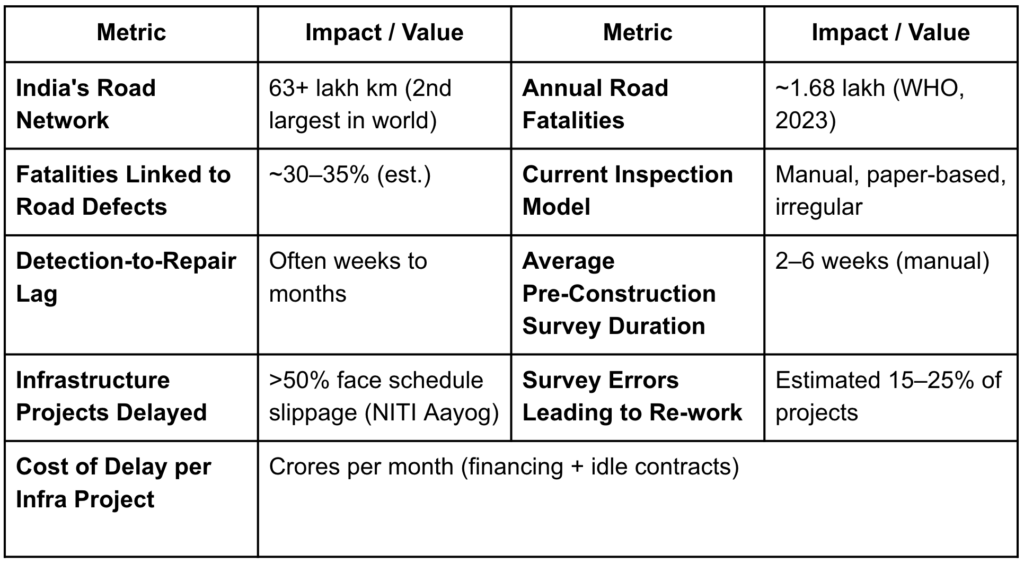 India faces a critical infrastructure intelligence gap, exemplified by its severe road safety crisis and bottlenecked pre-construction surveys. Accounting for nearly 11% of global road accident fatalities (over 1.68 lakh deaths annually), India’s roads are among the most dangerous, largely due to undetected defects like potholes and cracks. The current reliance on inefficient, inconsistent manual inspection teams fails to scale across the country’s 63+ lakh kms road network, leading to delayed reports and poor remediation prioritization.