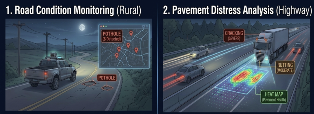 Prevention of Road Accidents by Automated Mapping of Roads. The 3D Surveyor’s road intelligence uses computer vision and AI to continuously scan road surfaces, identifying, classifying, and geo-tagging defects like potholes, cracks, edge damage, drainage failures. It can survey hundreds of km daily with consistent accuracy which provides maintenance teams with prioritized repair lists, enabling proactive defect repair before accidents occur.